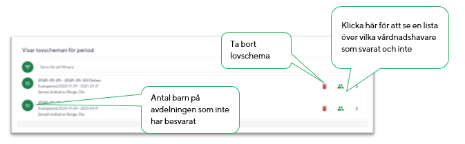 I vyn Skapa lovschema visas alla befintliga lovförfrågningar. Intill varje visas i en grön ikon hur många vårdnadshavare som inte har svarat på den aktuella lovförfrågan.