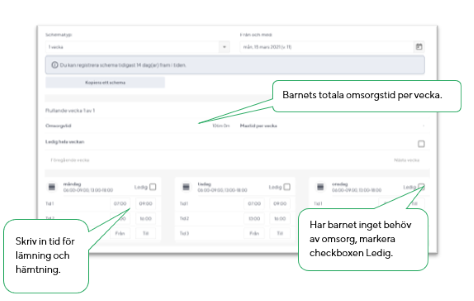 Har barnet inget behov av förskola/fritidshem en specifik veckodag markeras checkboxen Ledig.