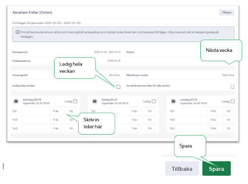• Checkboxen Använd samma tider för alla veckor markeras om barnet har samma tider inom lovperioden.